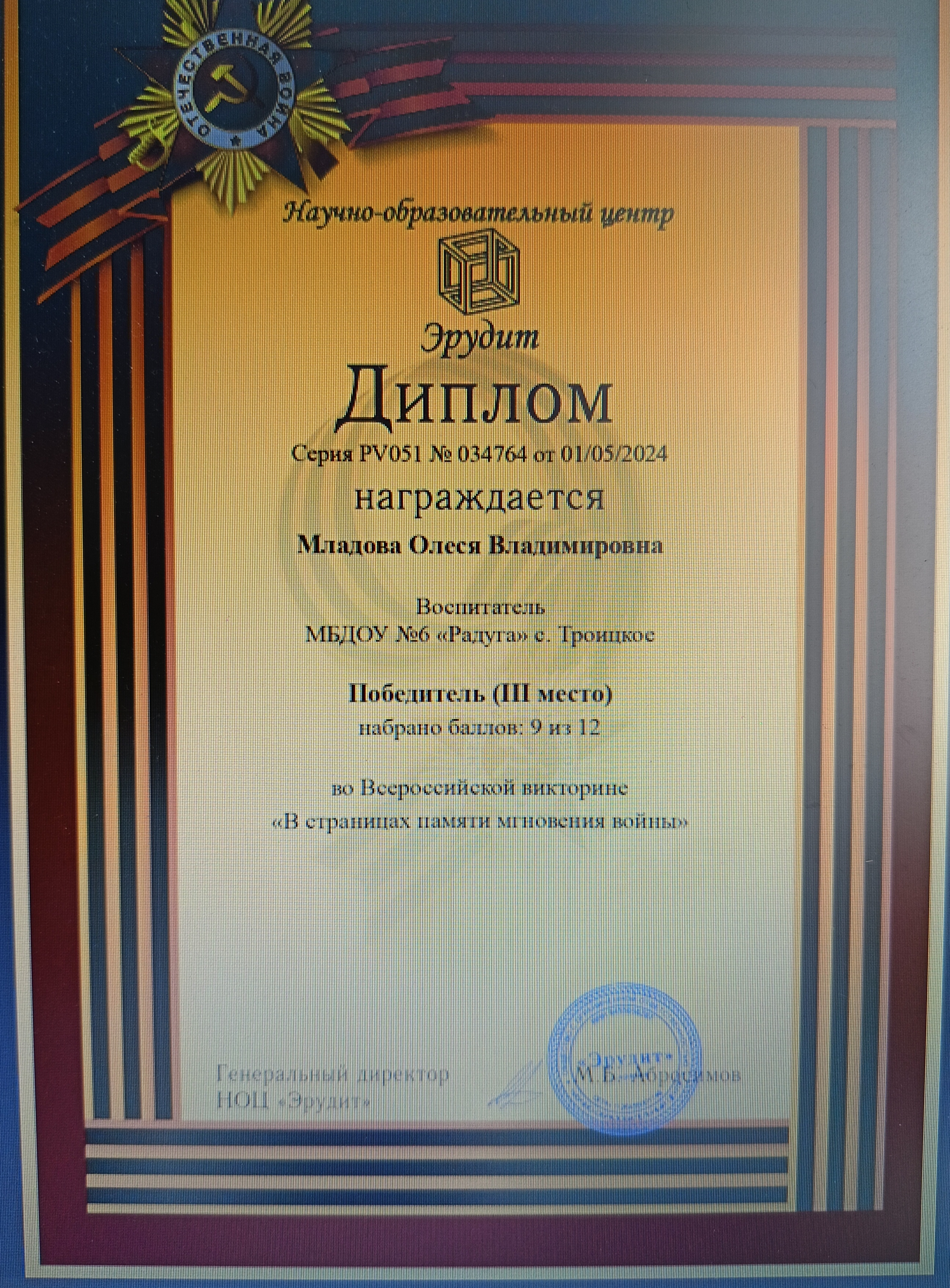 Диплом победителя (III место) Всероссийской викторины "В страницах памяти мгновения войны"
