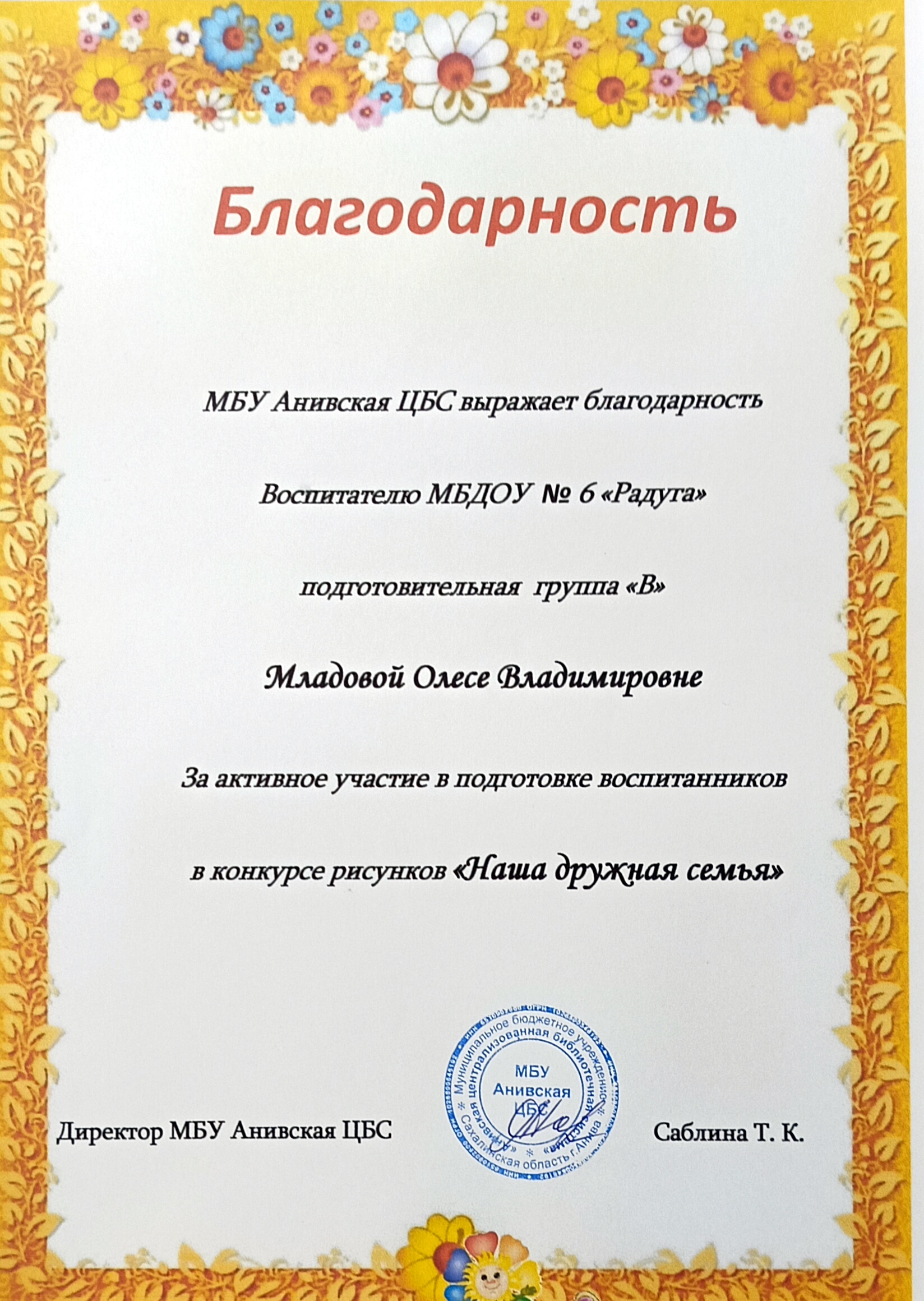 Благодарность МБУ Анивской ЦБС за активное участие в подготовке воспитанников в конкурсе рисунков "Наша дружная семья", 2024 г.