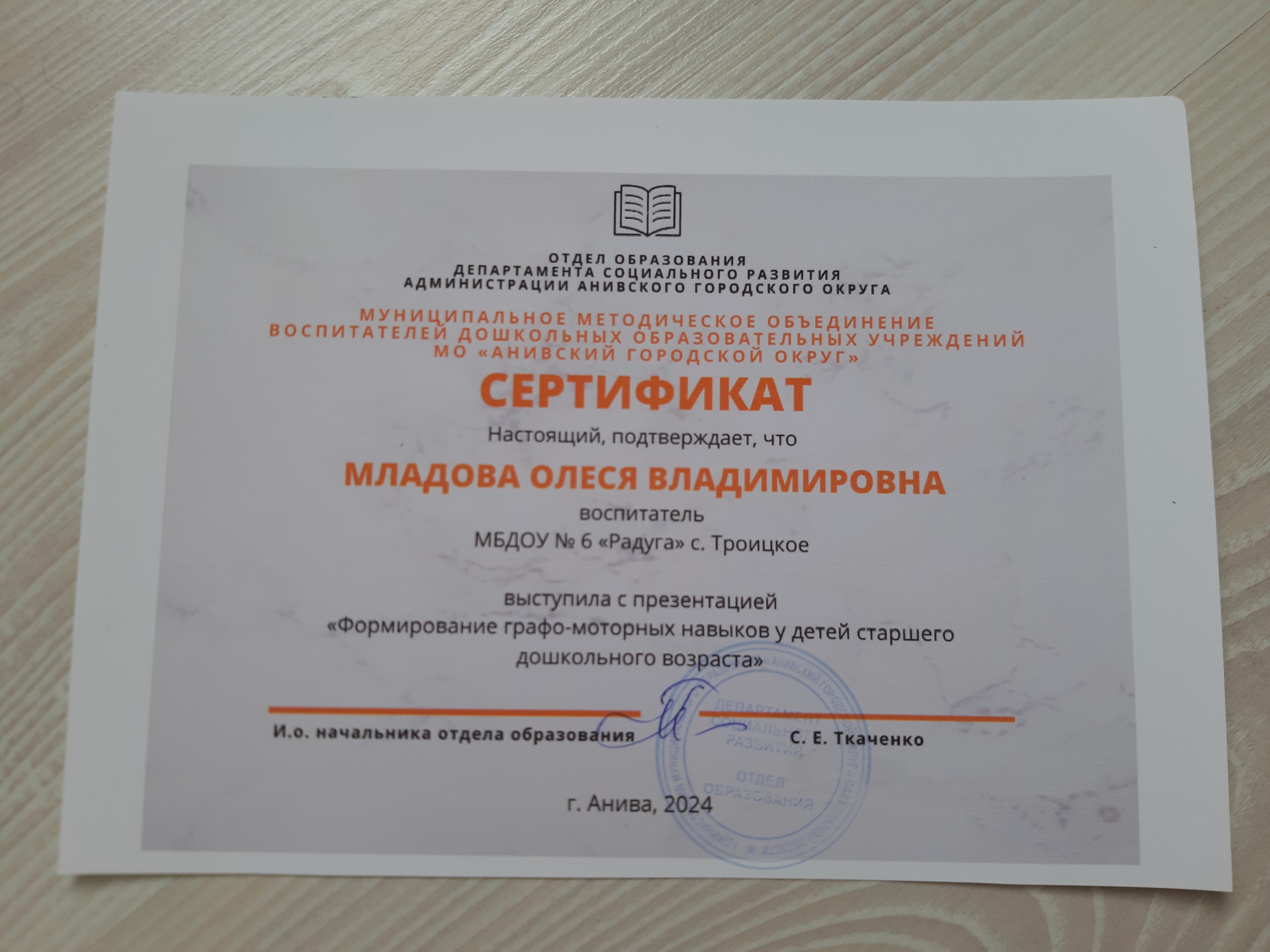 Сертификат об участии в Муниципальном методическом объединении воспитателей дошкольных образовательных учреждений МО "Анивский Городской Округ". Презентация по теме "Формирование графо-моторных навыков у детей старшего дошкольного возраста"