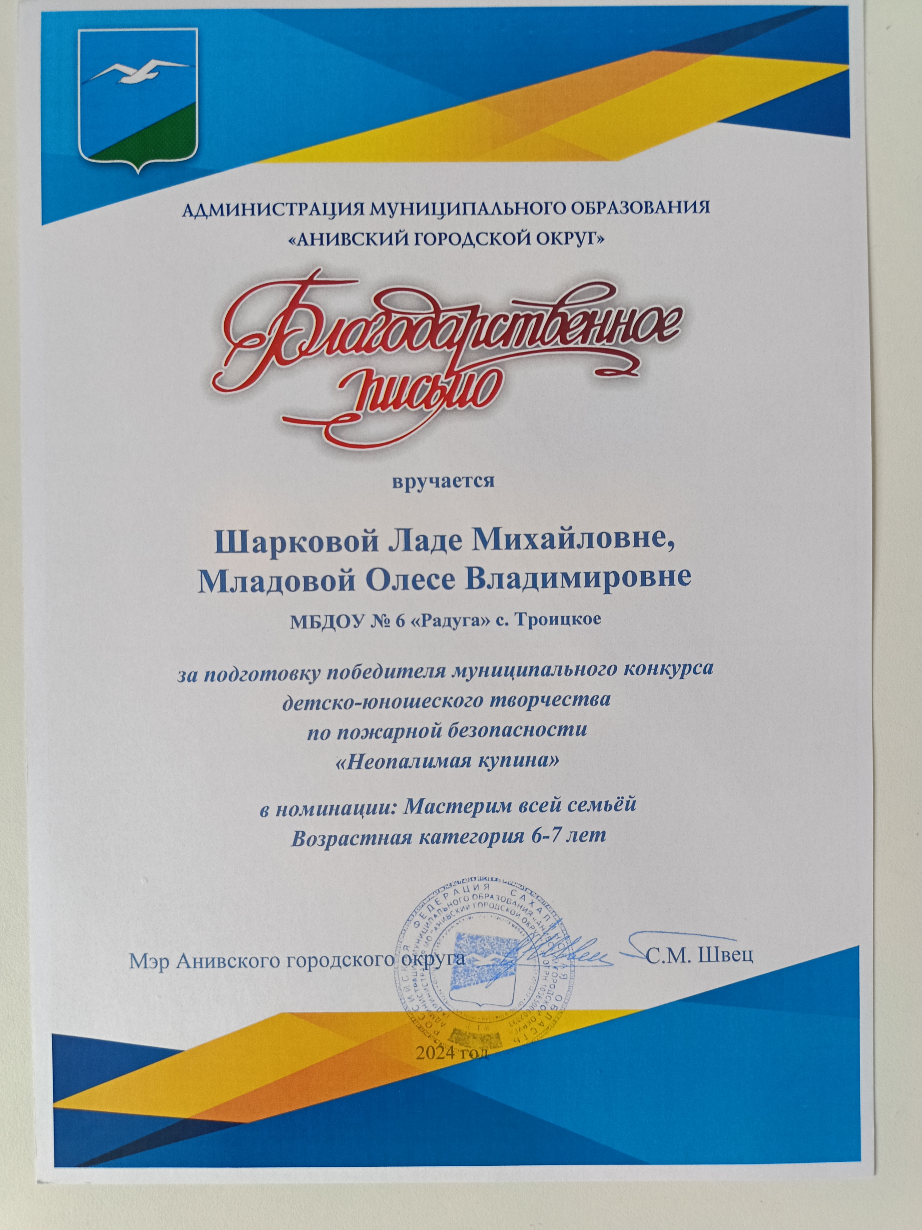 Благодарственное письмо от Администрации муниципального образования "Анивский Городской Округ" за подготовку победителя муниципального конкурса детско-юношеского творчества по пожарной безопасности "Неопалимая купина" в номинации "Мастерим всей семьей", 2024 г.