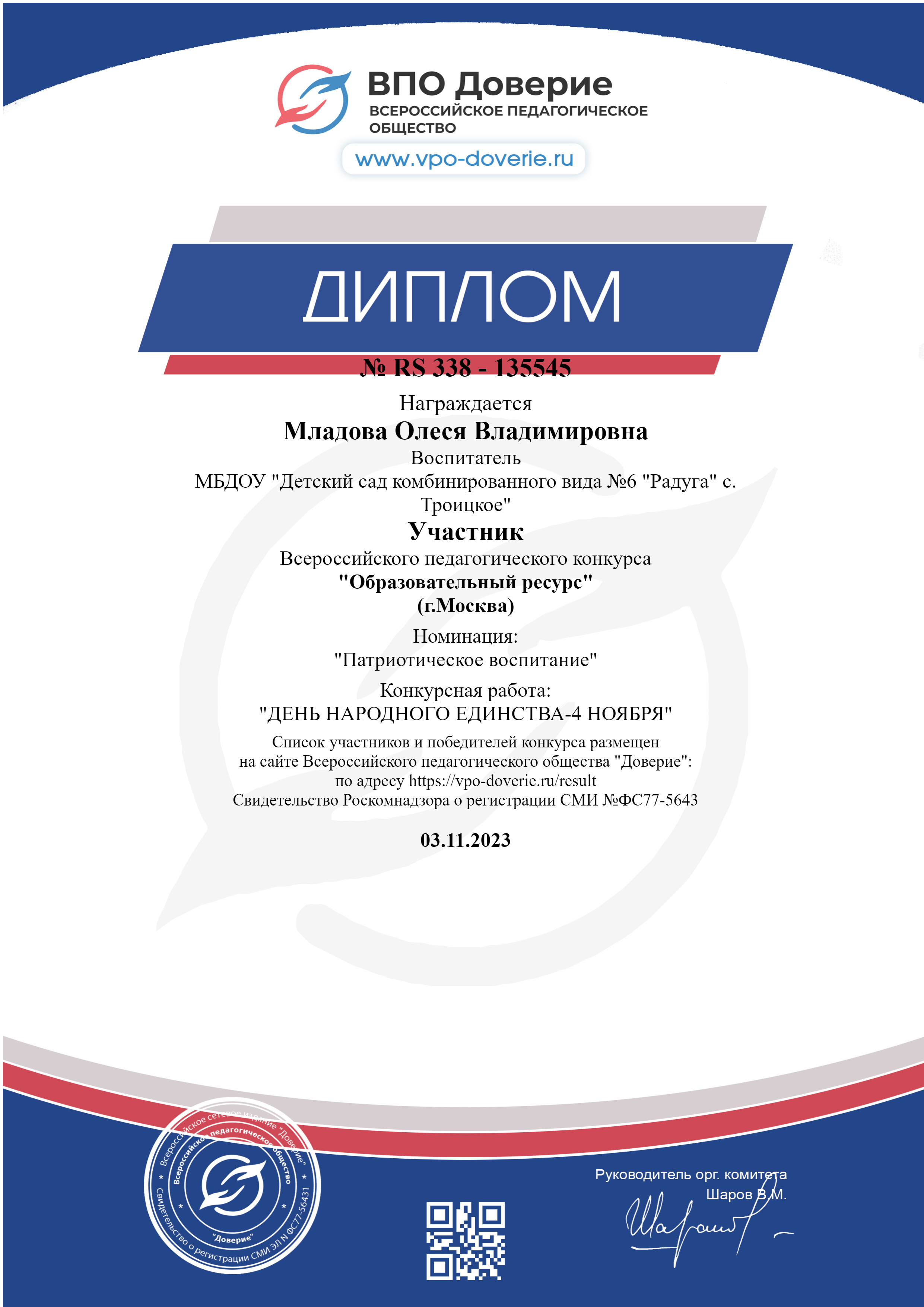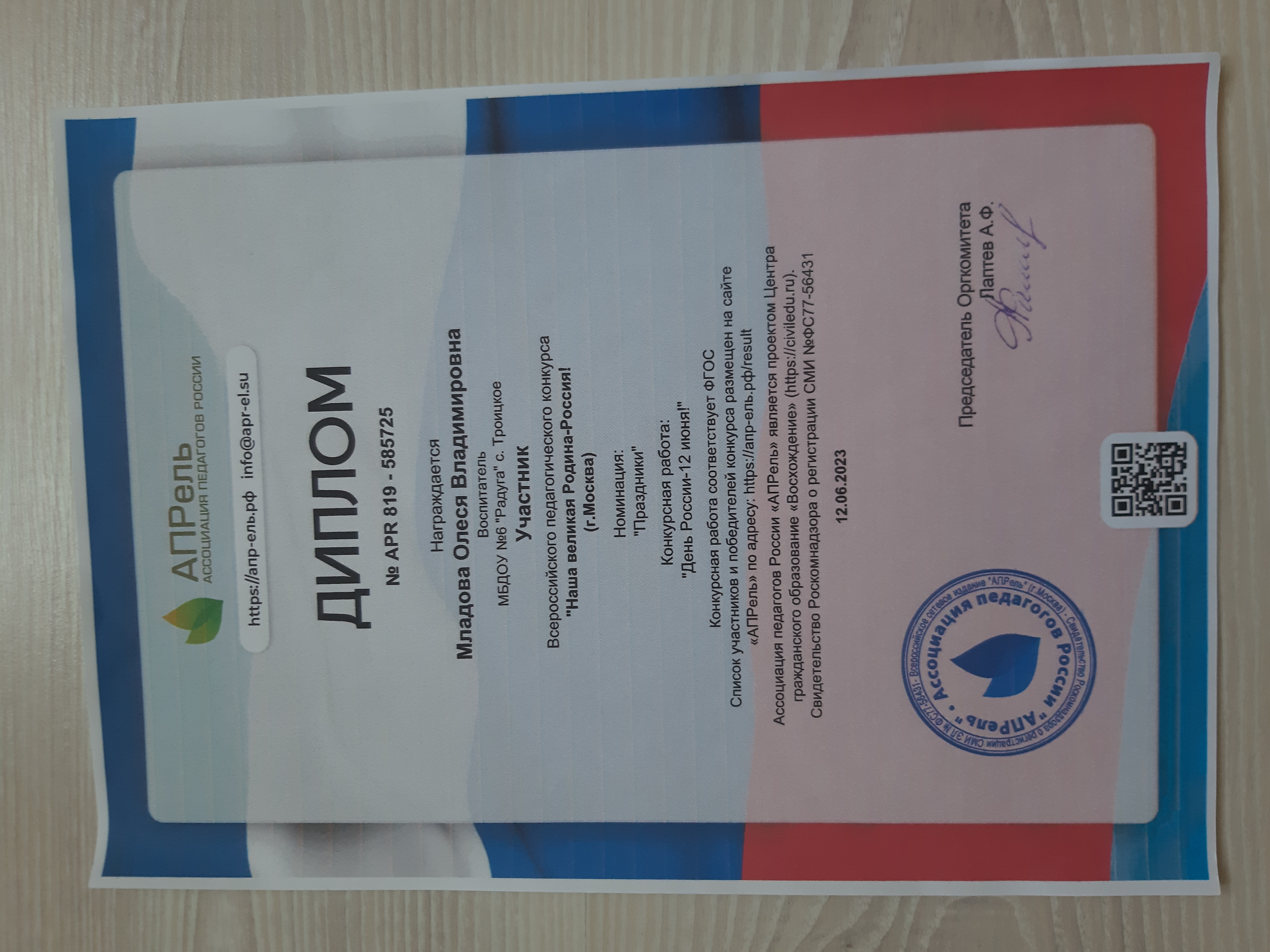 Диплом участника Всероссийского педагогического конкурса "Наша великая Родина-Россия!"