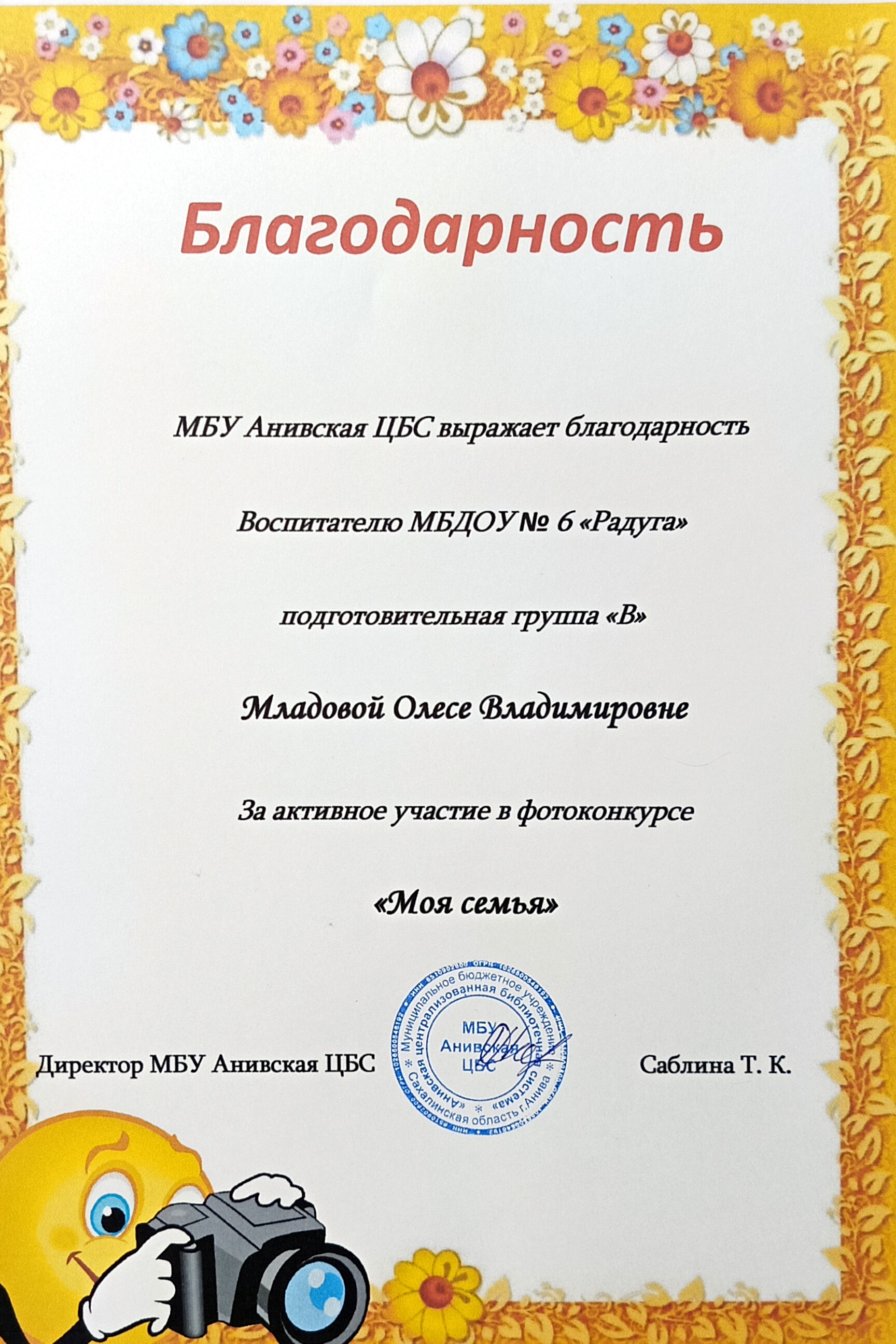 Благодарность МБУ Анивской ЦБС за активное участие в фотоконкурсе "Моя семья", 2024 г.