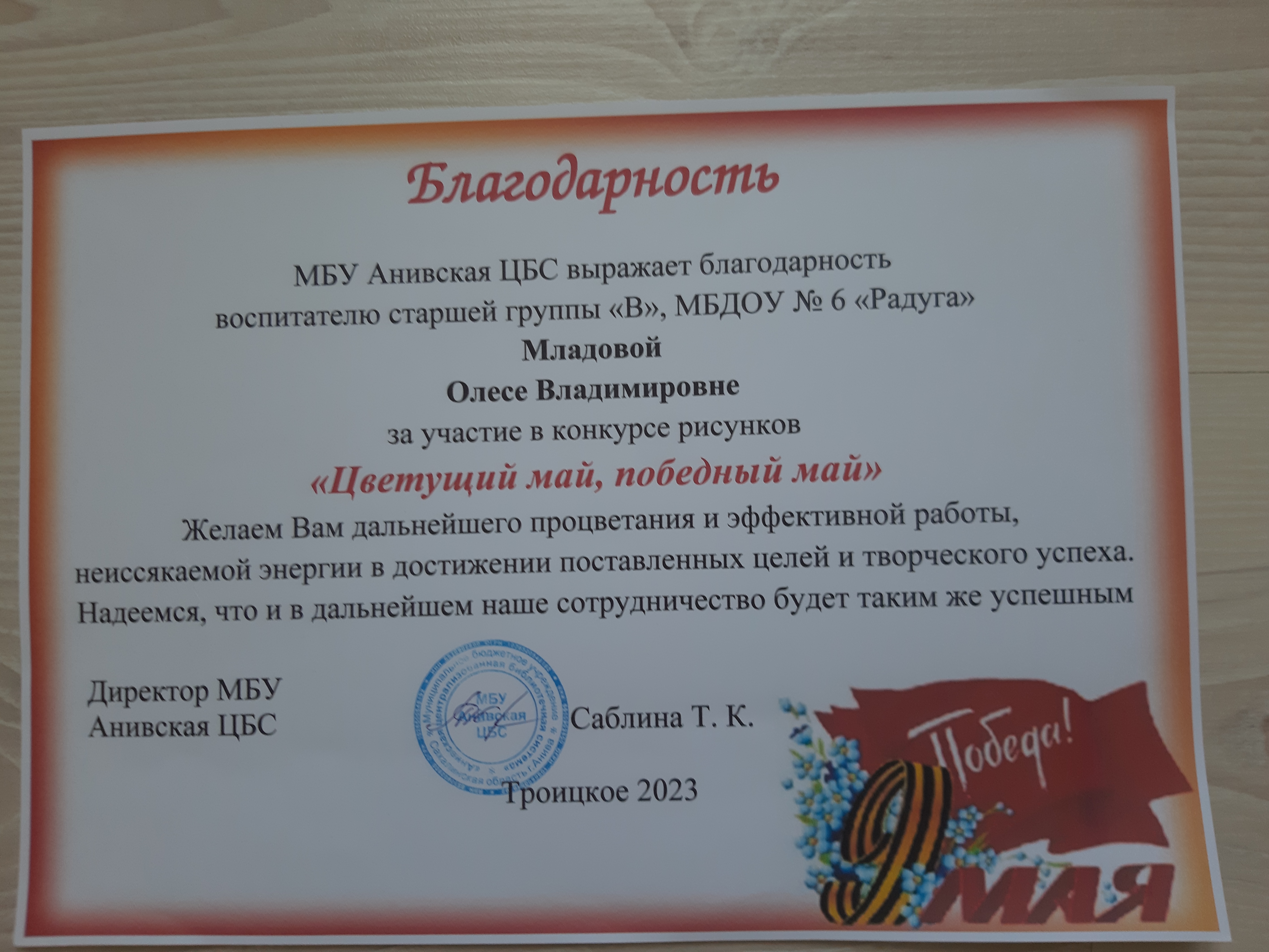 Благодарность за участие в конкурсе рисунков "Цветущий май, победный май"