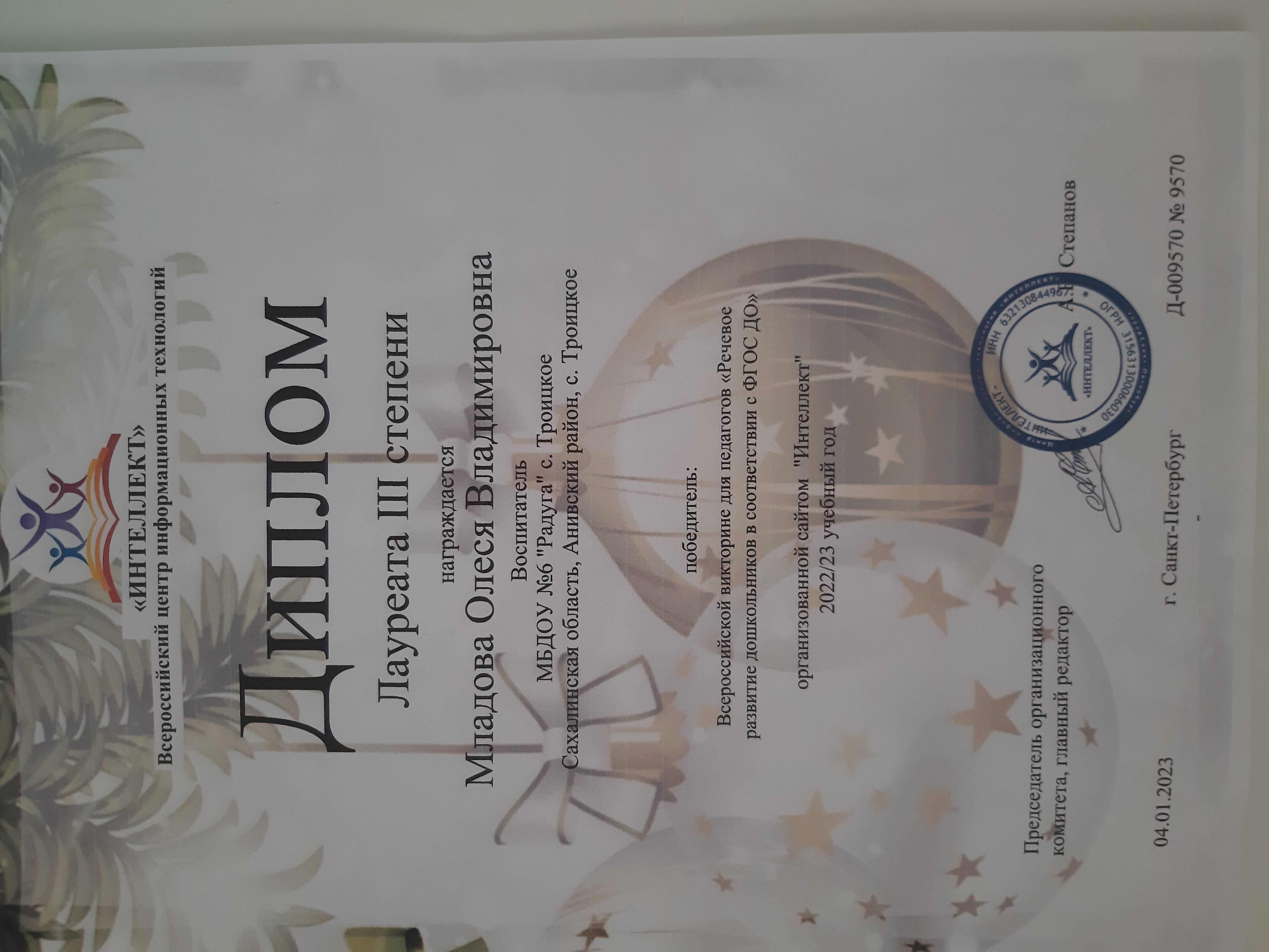 Лауреат III степени во Всероссийской викторине для педагогов "Речевое развитие дошкольников в соответствии ФГОС ДО"
