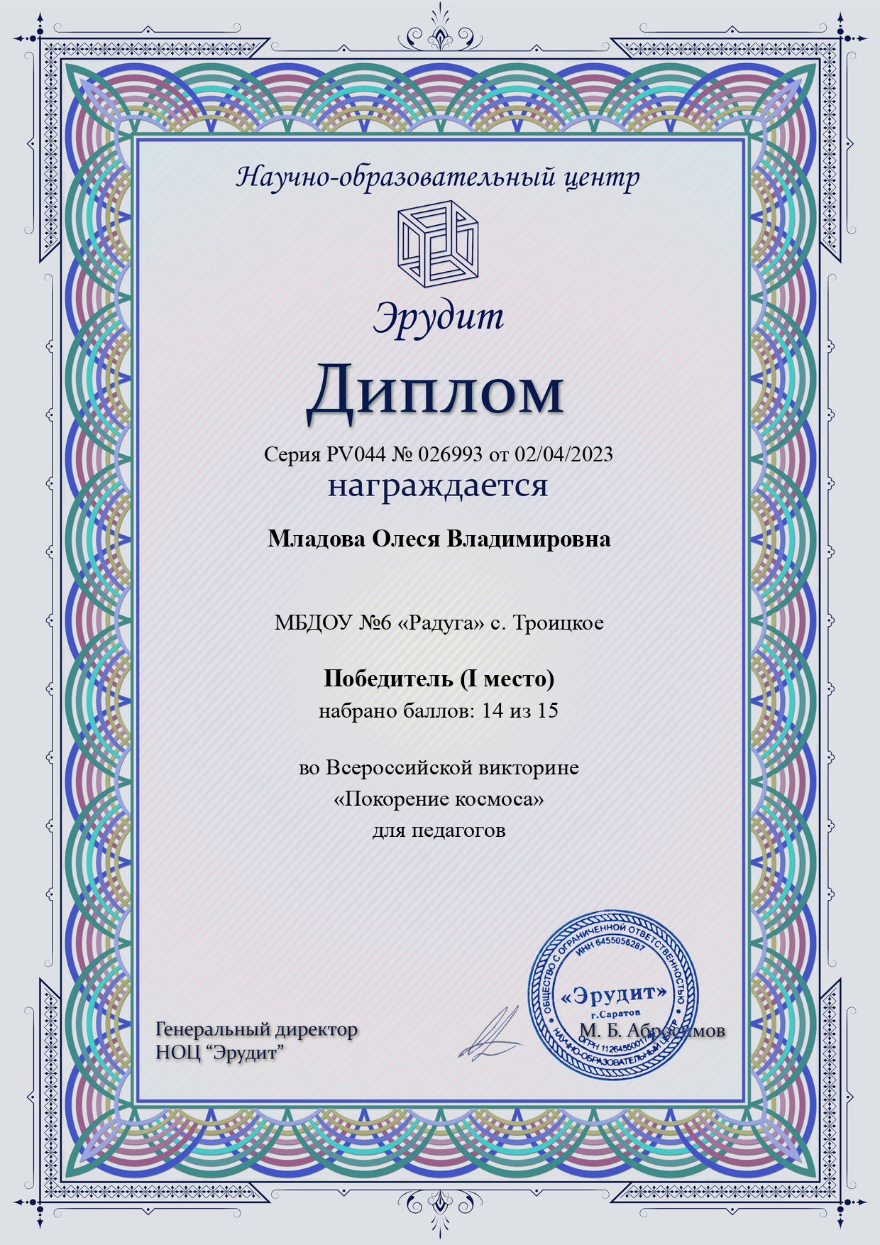 Диплом победителя (I место) во Всероссийской викторине "Покорение космоса" для педагогов