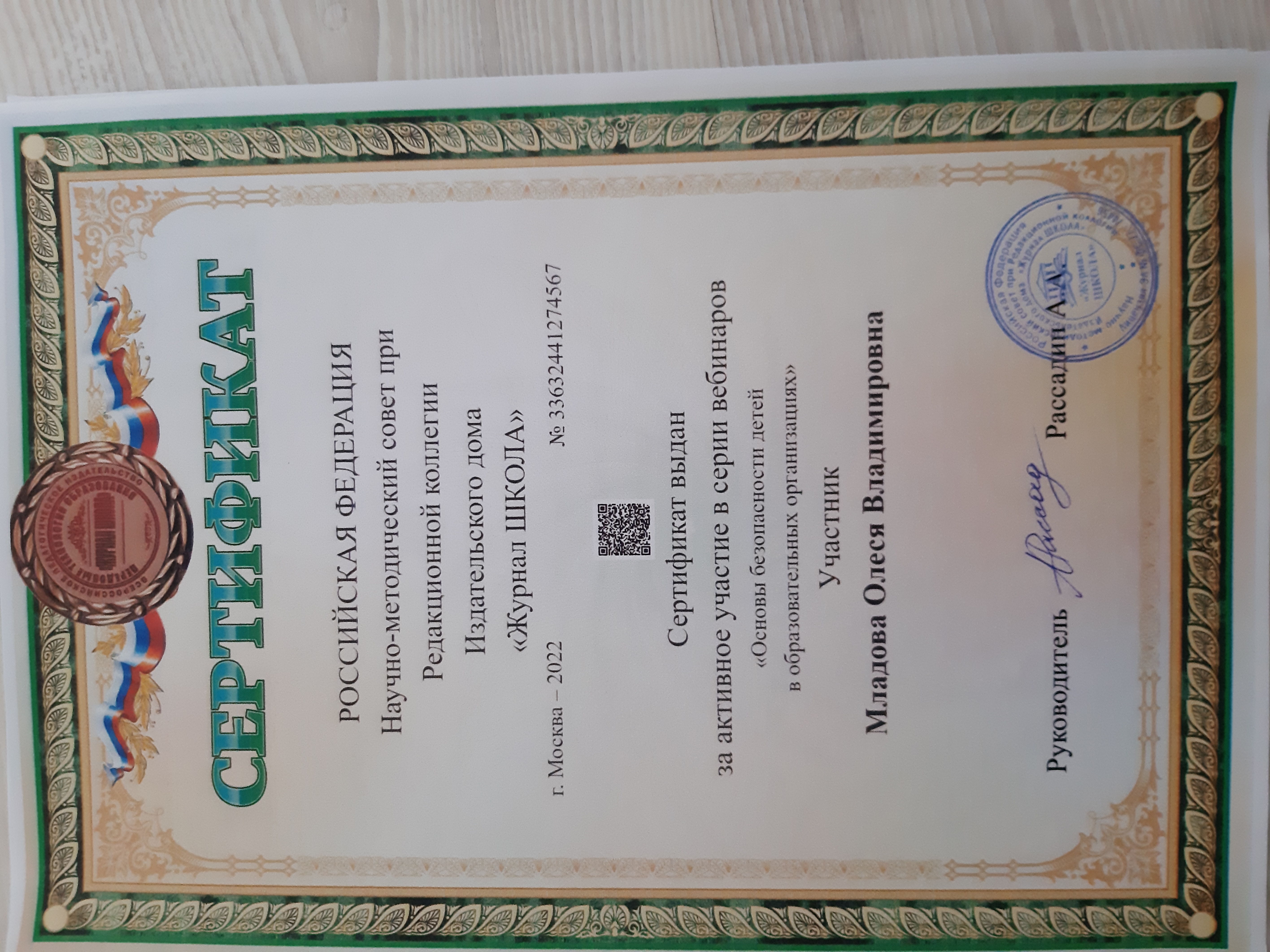 Сертификат за активное участие в серии вебинаров "Основы безопасности детей в образовательных организациях"