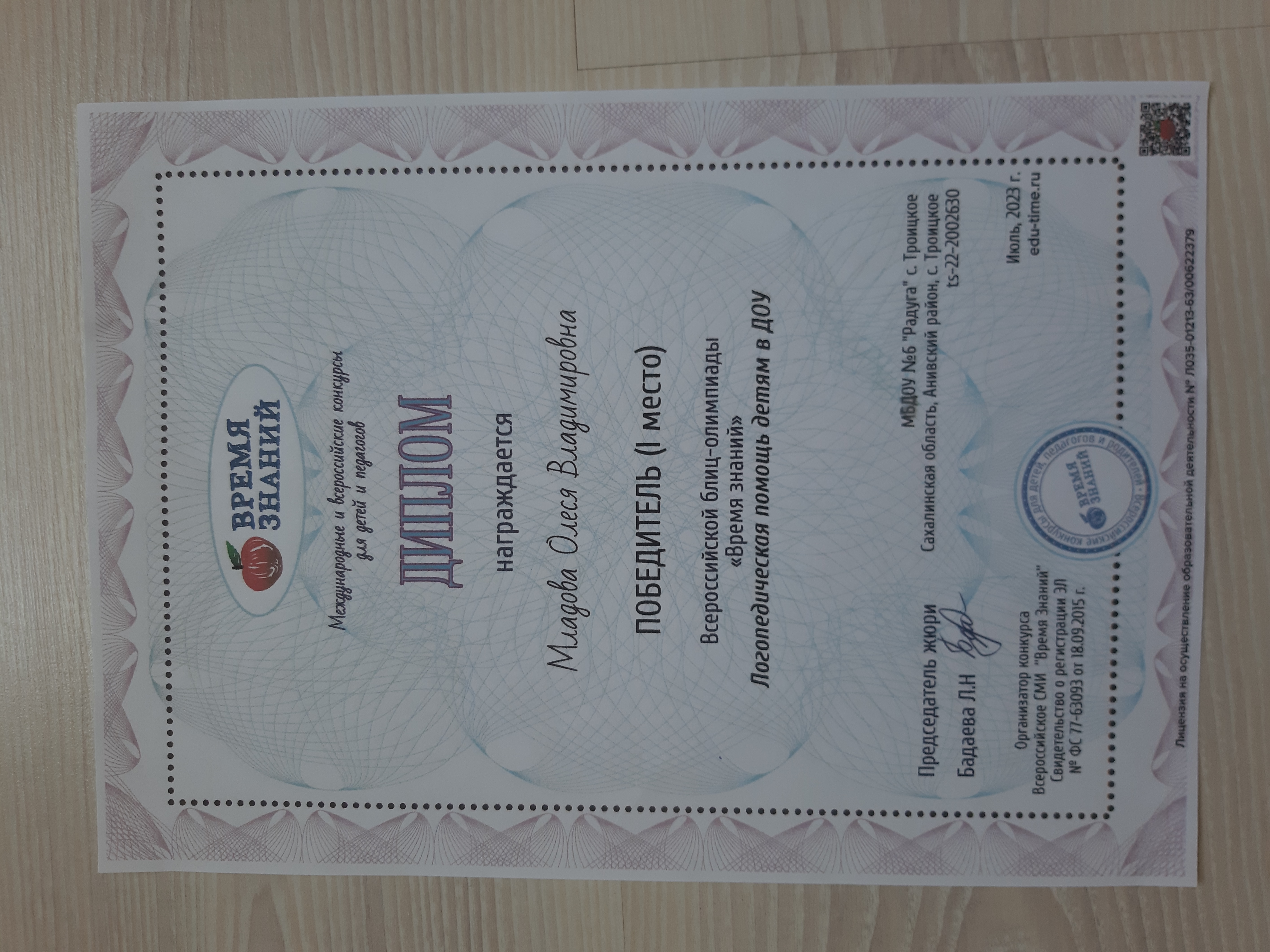 Диплом победителя (I место) во Всероссийской блиц-олимпиаде "Время знаний" Логопедическая помощь детям в ДОУ