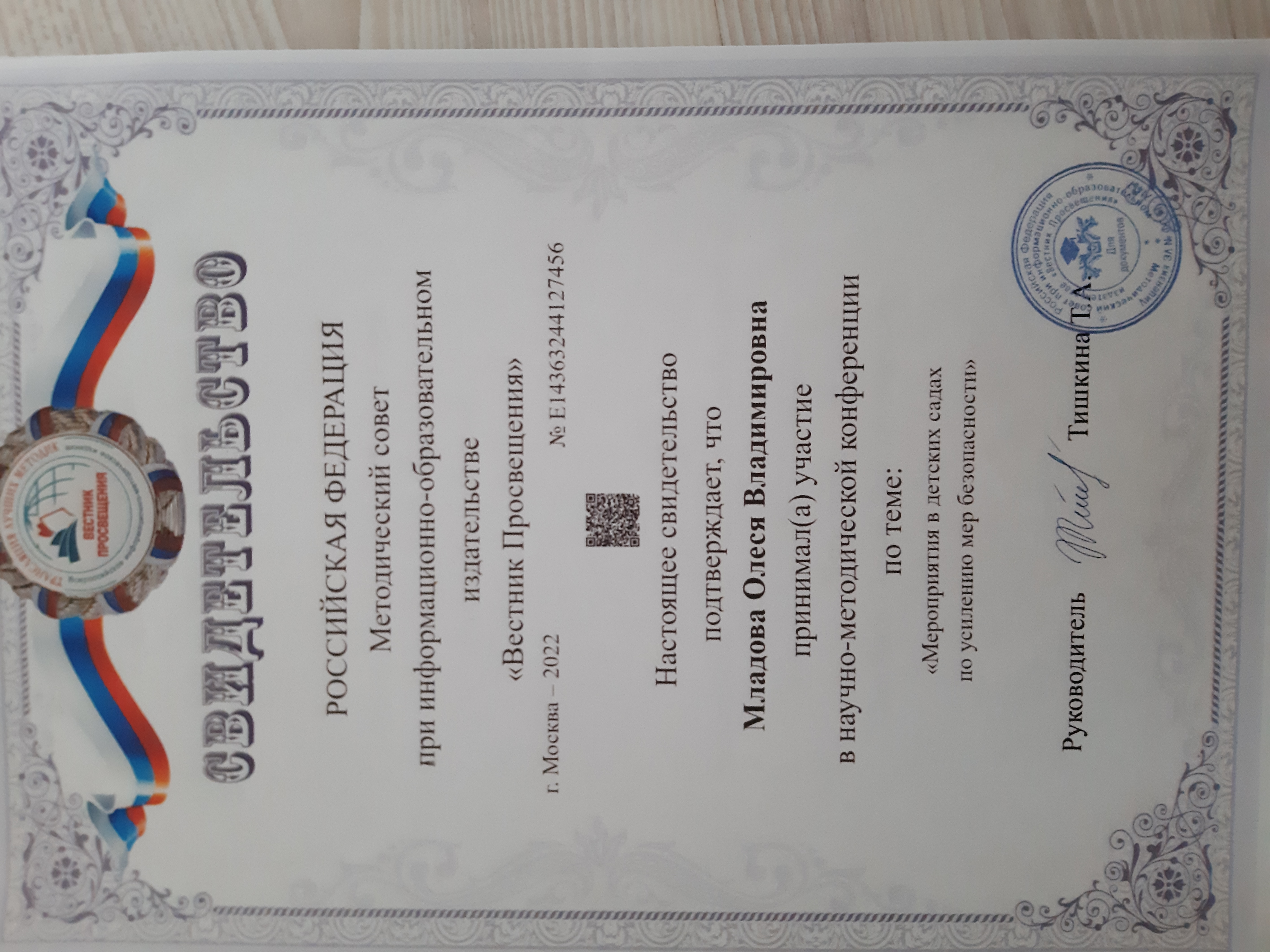 Свидетельство об участии в научно-методической конференции по теме: "Мероприятия в детских садах по усилению мер безопасности"