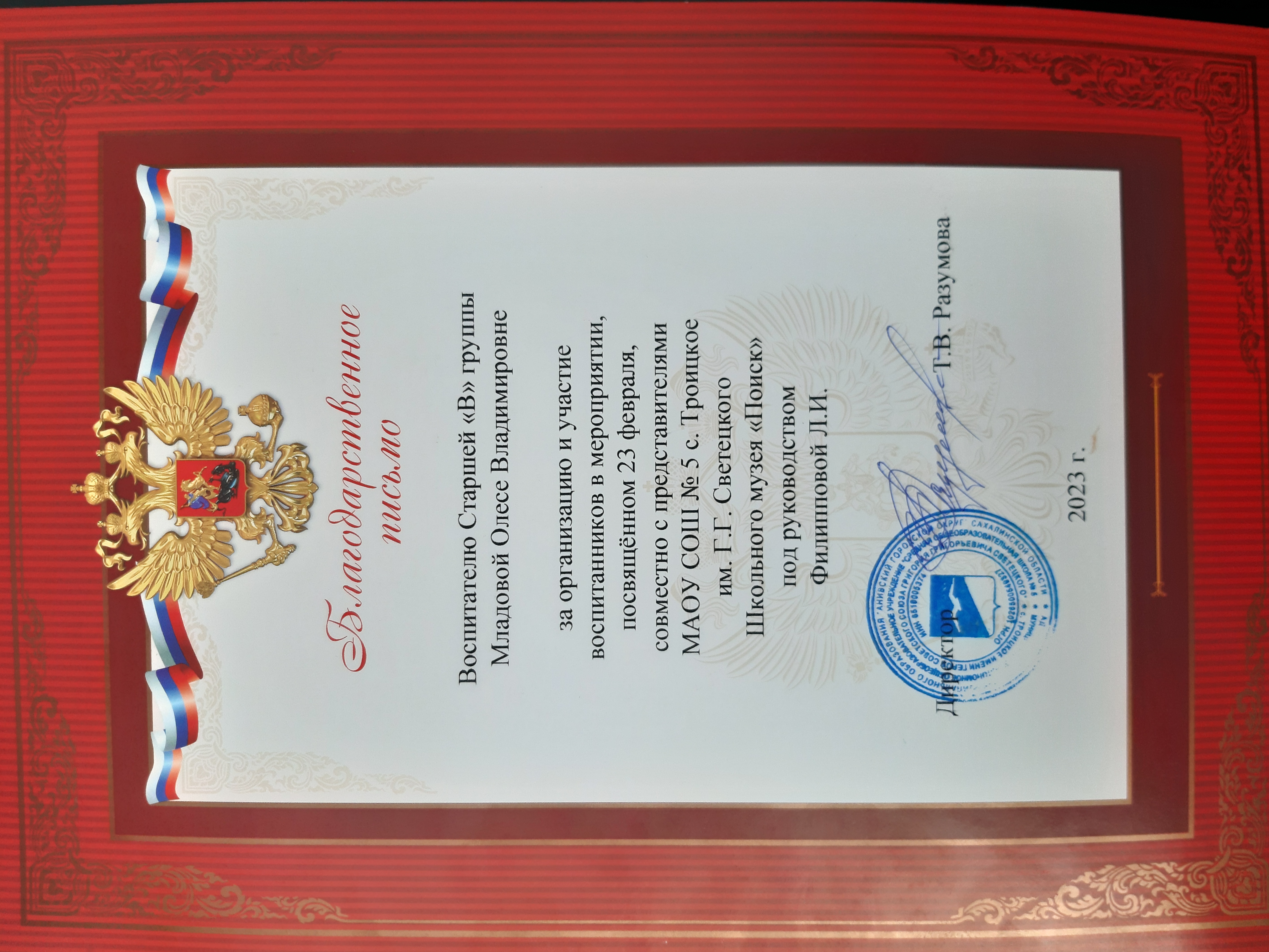 Благодарственное письмо за организацию и участие воспитанников в мероприятии, посвященном 23 февраля, совместно с представителями МАОУ СОШ № 5 с. Троицкое им. Г.Г. Светецкого Школьного музея "Поиск" под руководством Филипповой Л.И.