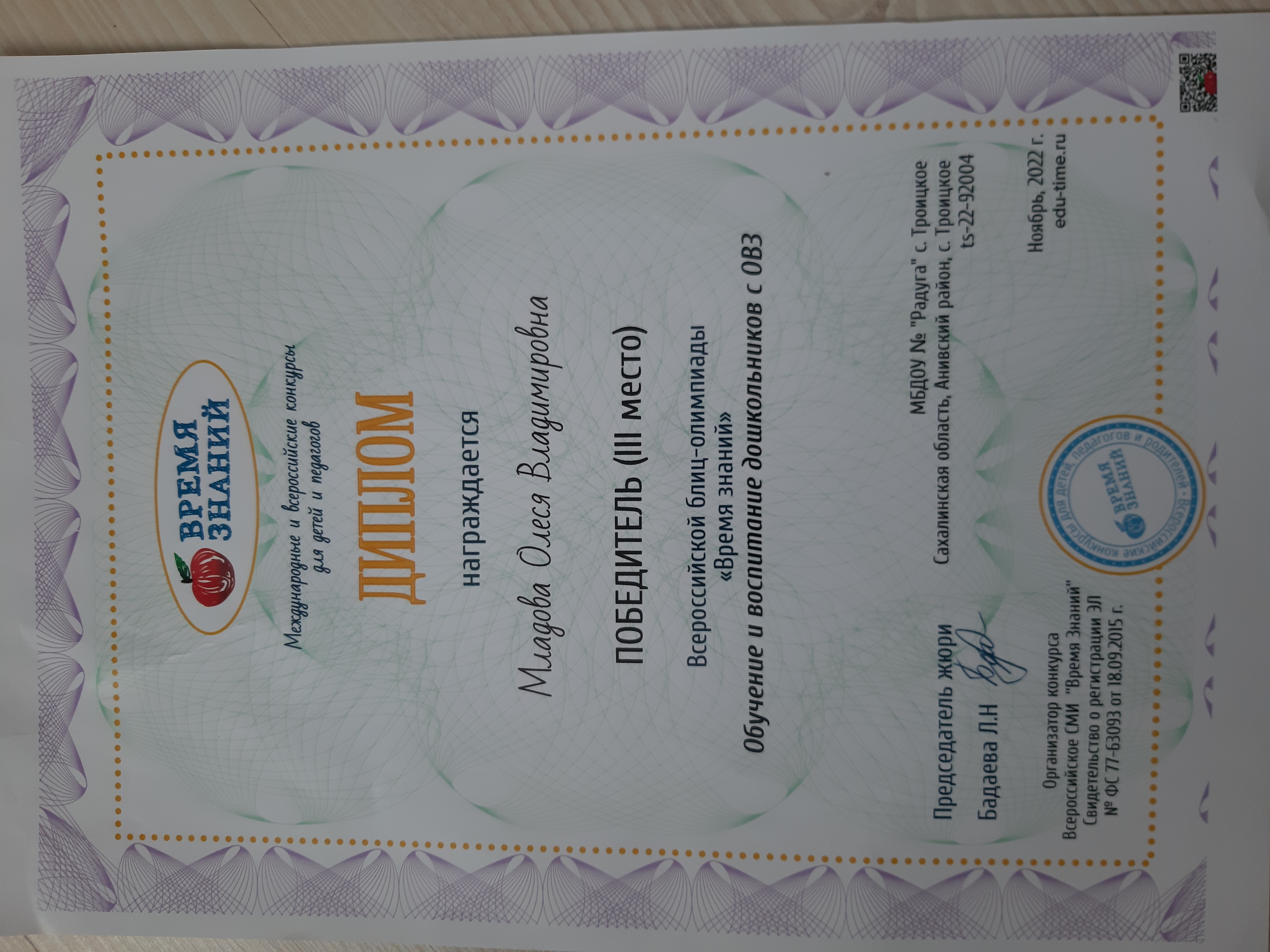 Всероссийская блиц-олимпиада "ВРЕМЯ ЗНАНИЙ". Победитель III место. "Обучение и воспитание дошкольников с ОВЗ"