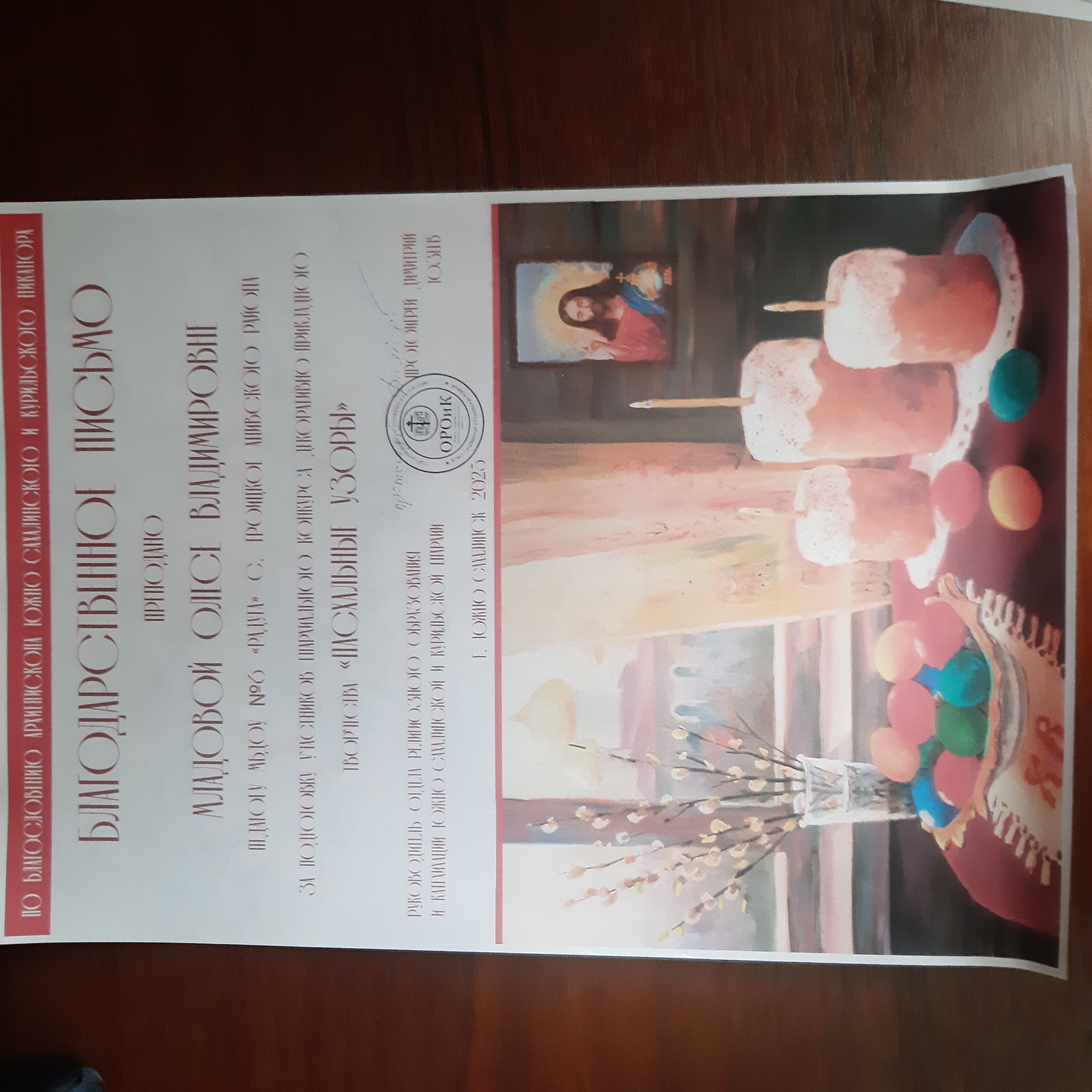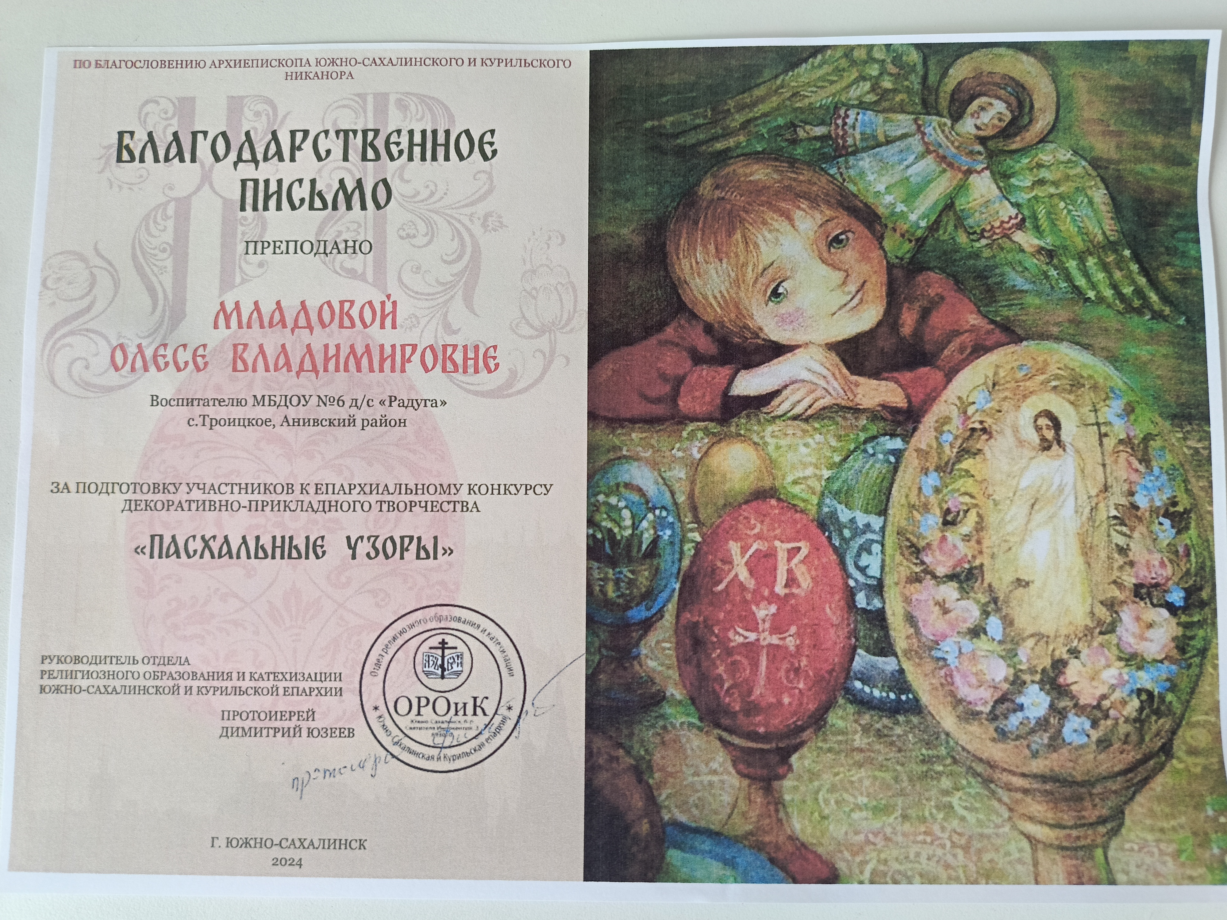 Благодарственное письмо за подготовку участников к епархиальному конкурсу декоративно-прикладного творчества "Пасхальные узоры", 2024 г.