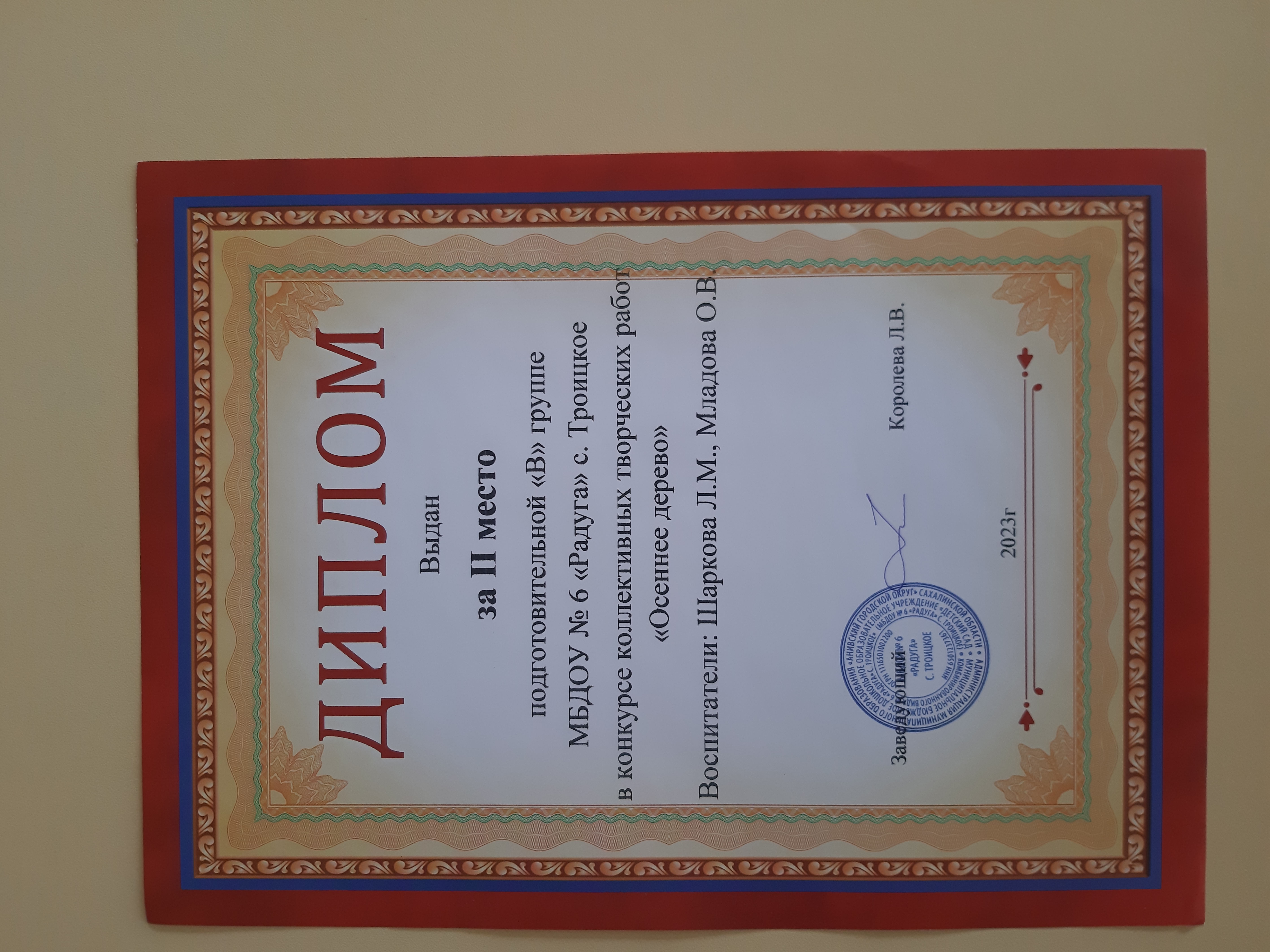Диплом за II место в конкурсе коллективных творческих работ "Осеннее дерево"