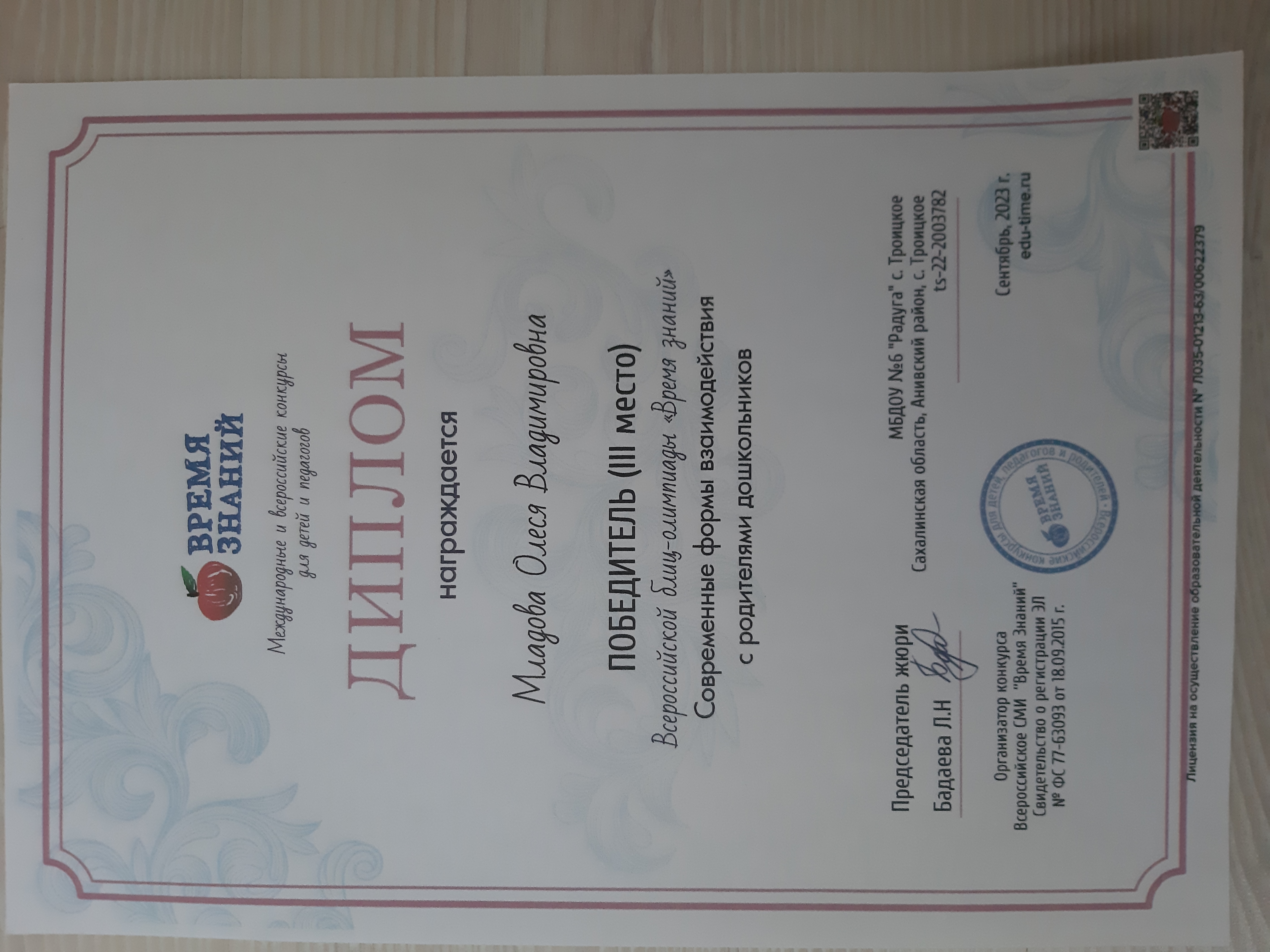 Диплом победителя (III место) во Всероссийской блиц-олимпиаде "Время знаний". Современные формы взаимодействия с родителями дошкольников
