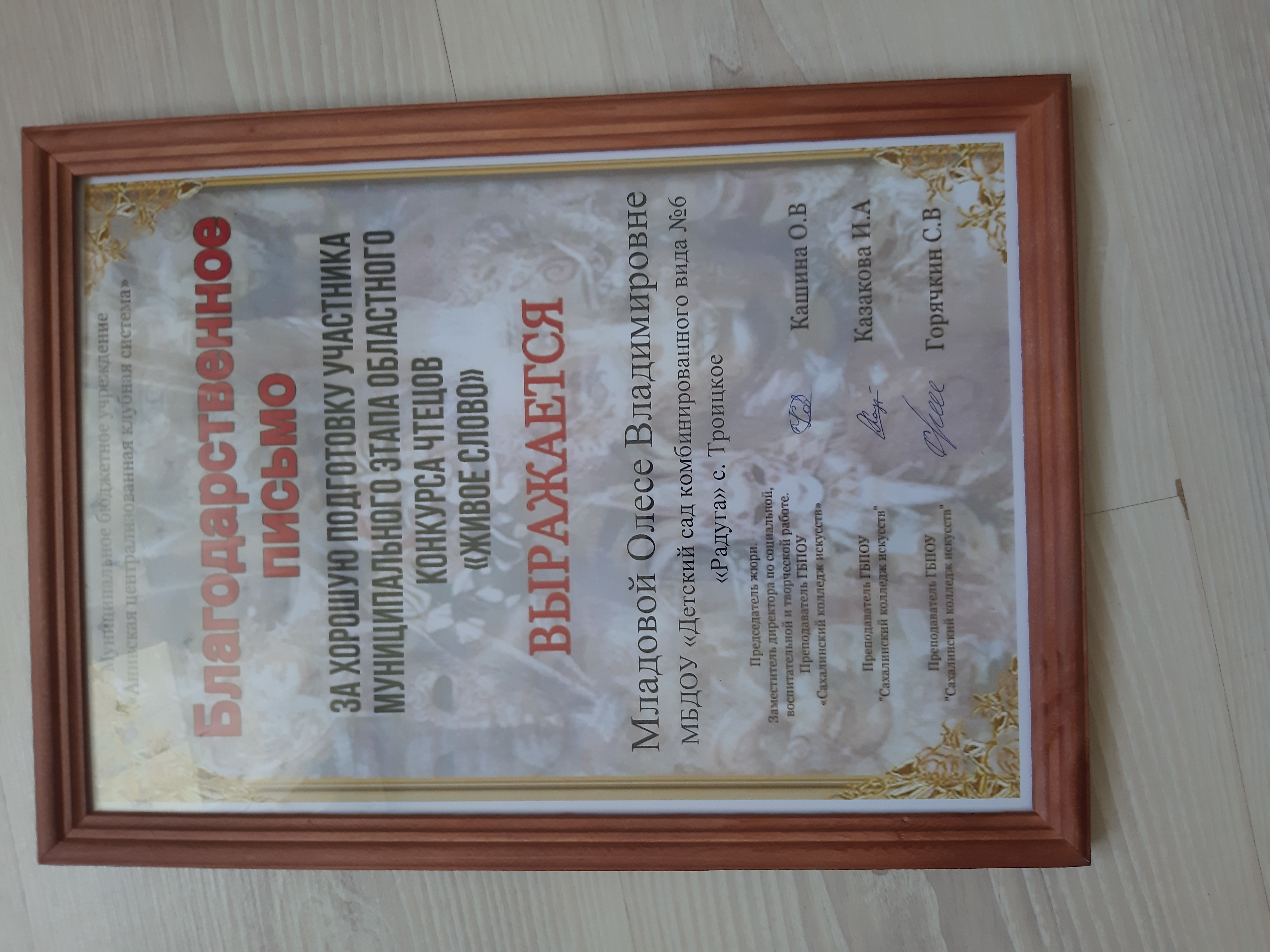 Благодарственное письмо за хорошую подготовку участника муниципального этапа областного конкурса чтецов "Живое слово"