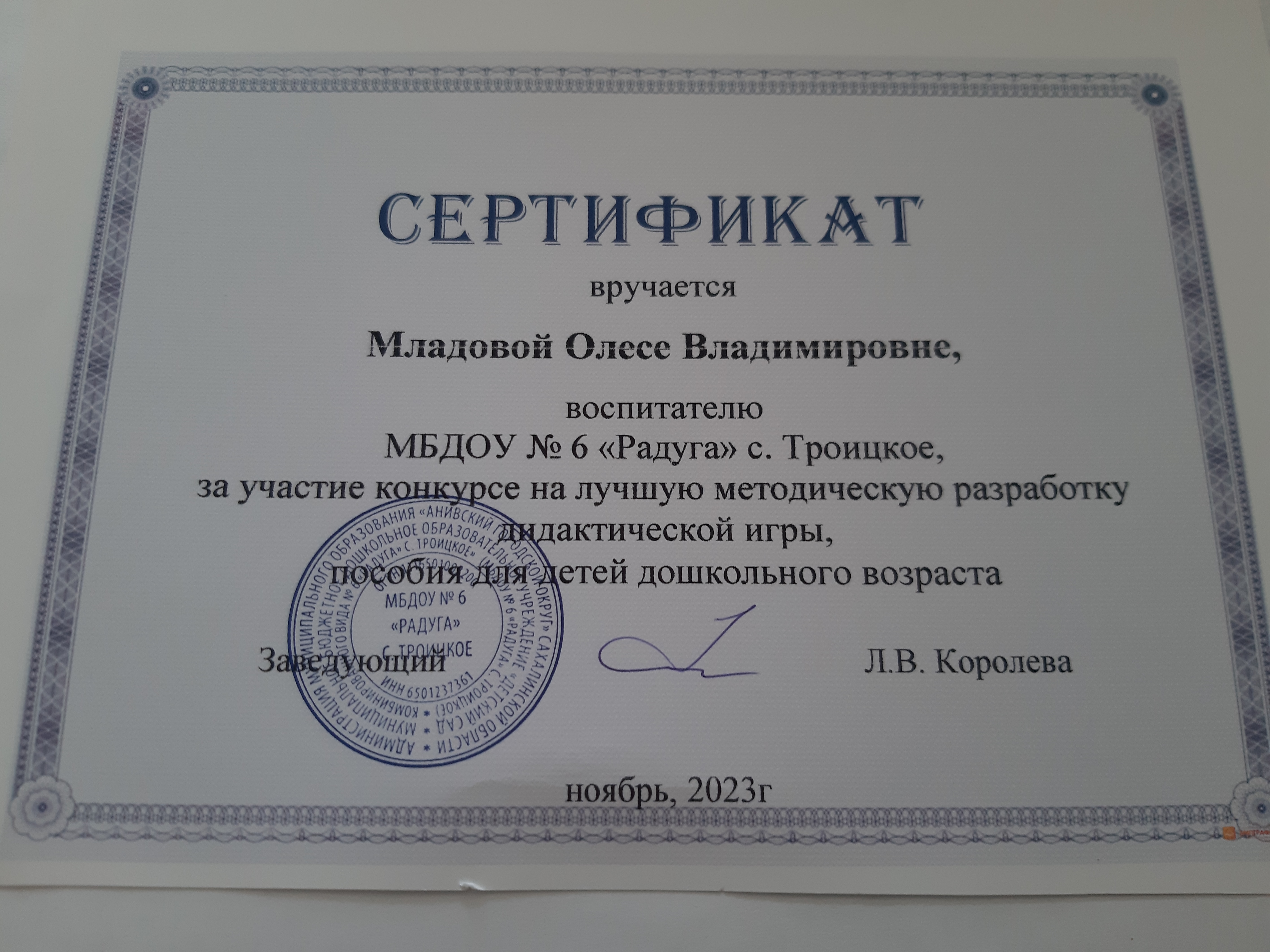 Сертификат за участие в конкурсе на лучшую методическую разработку дидактической игры, пособия для детей дошкольного возраста