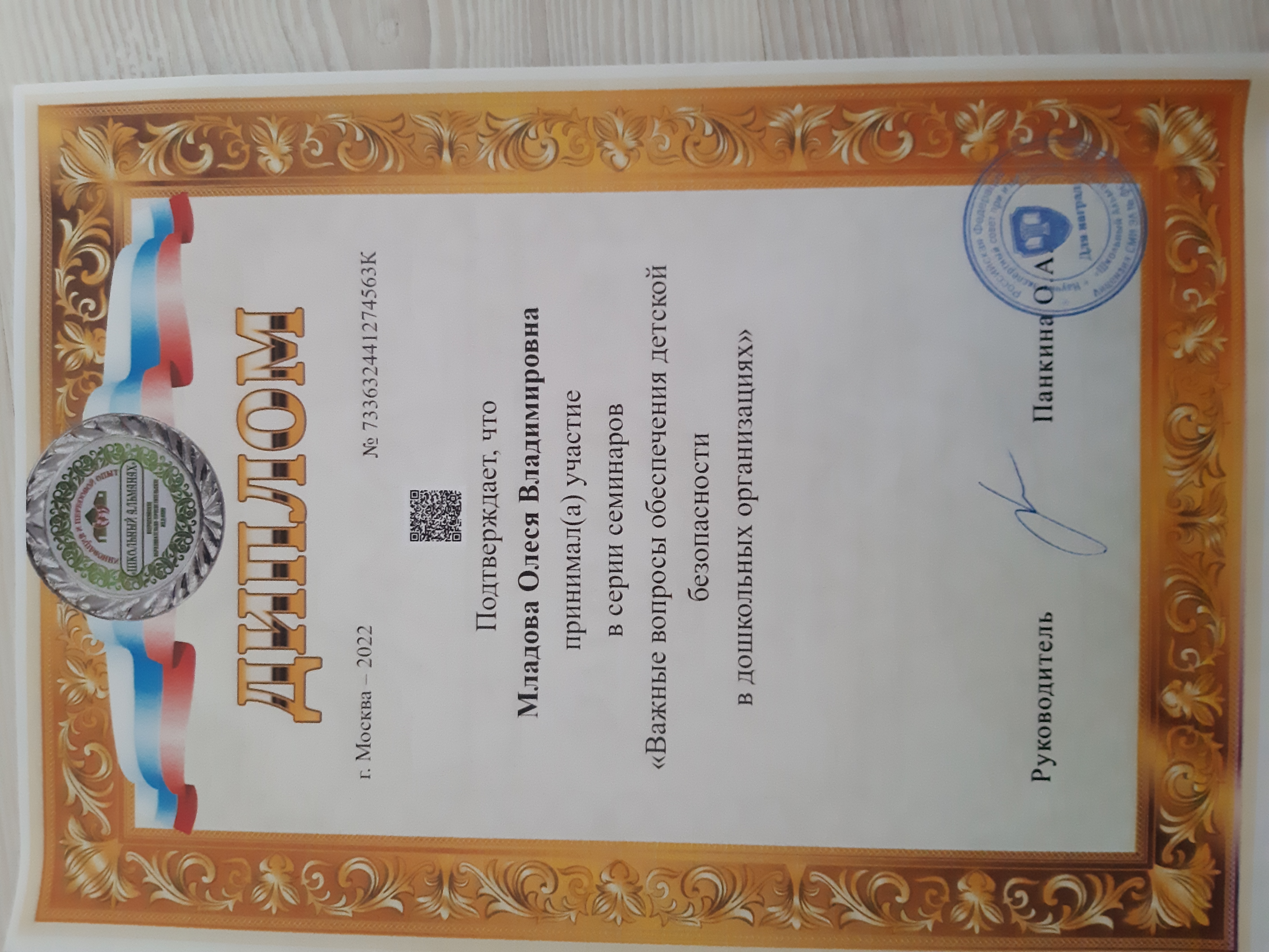Диплом, подтверждающий участие в серии семинаров "Важные вопросы обеспечения детской безопасности в дошкольных организациях"