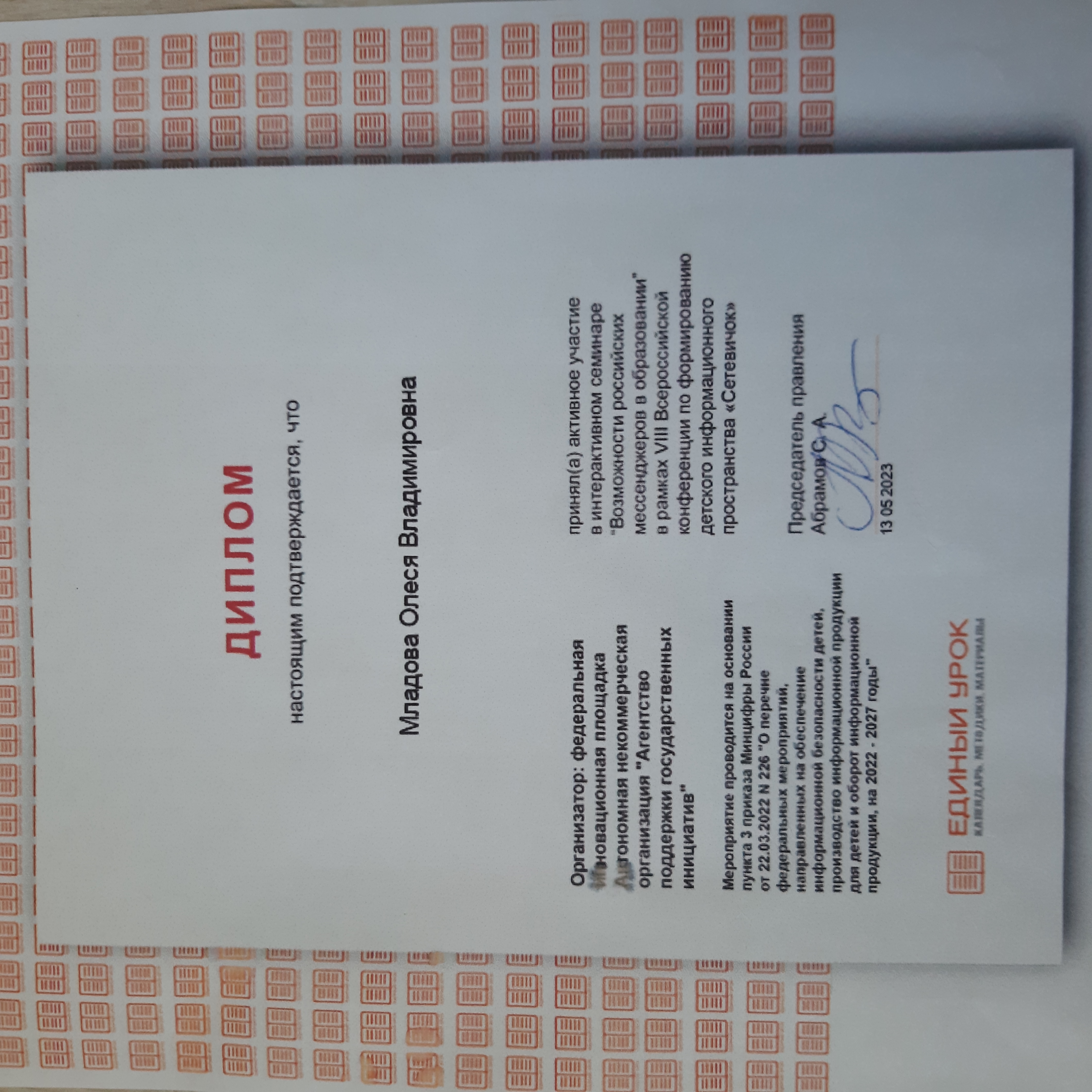 Диплом об активном участии в интерактивном семинаре "Возможности российских мессенжеров в образовании" в рамках VIII Всероссийской конференции по формированию детского информационного пространства "Сетевичок"
