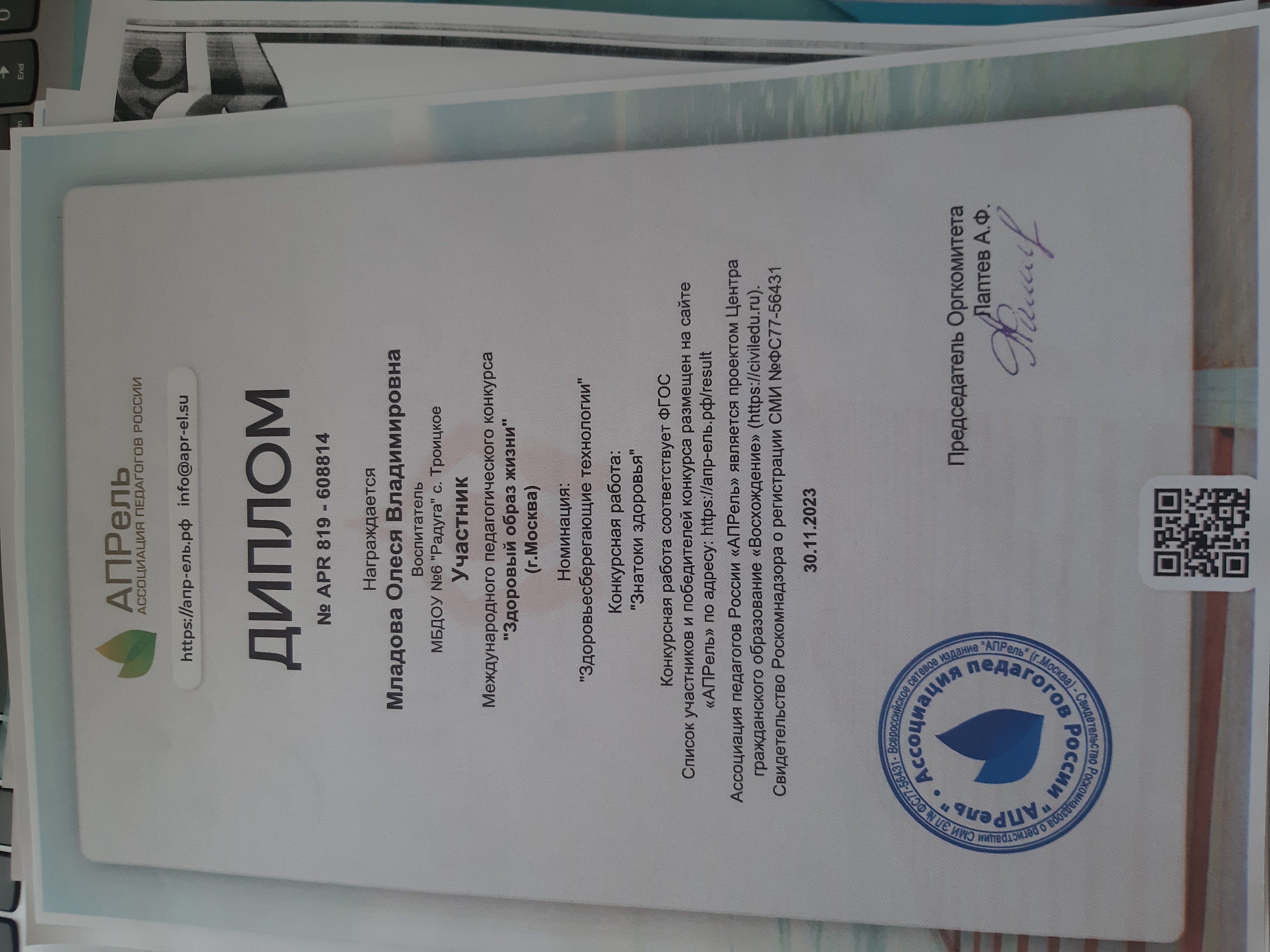 Диплом участника Международного педагогического конкурса "Здоровый образ жизни" в номинации "Здоровьесберегающие технологии"