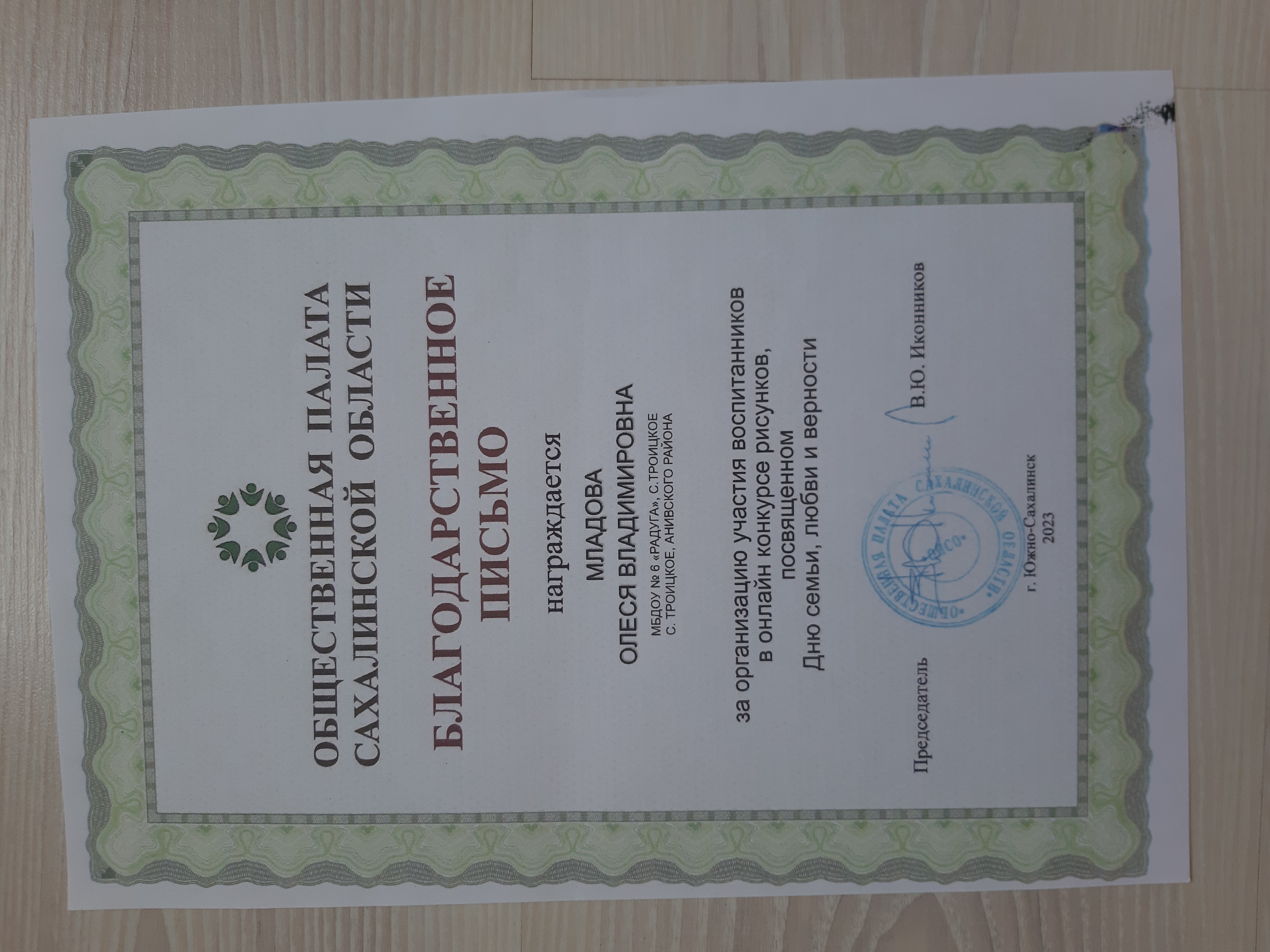 Благодарственное письмо за организацию участия воспитанников в онлайн-конкурсе рисунков, посвященном Дню любви, семьи и верности.