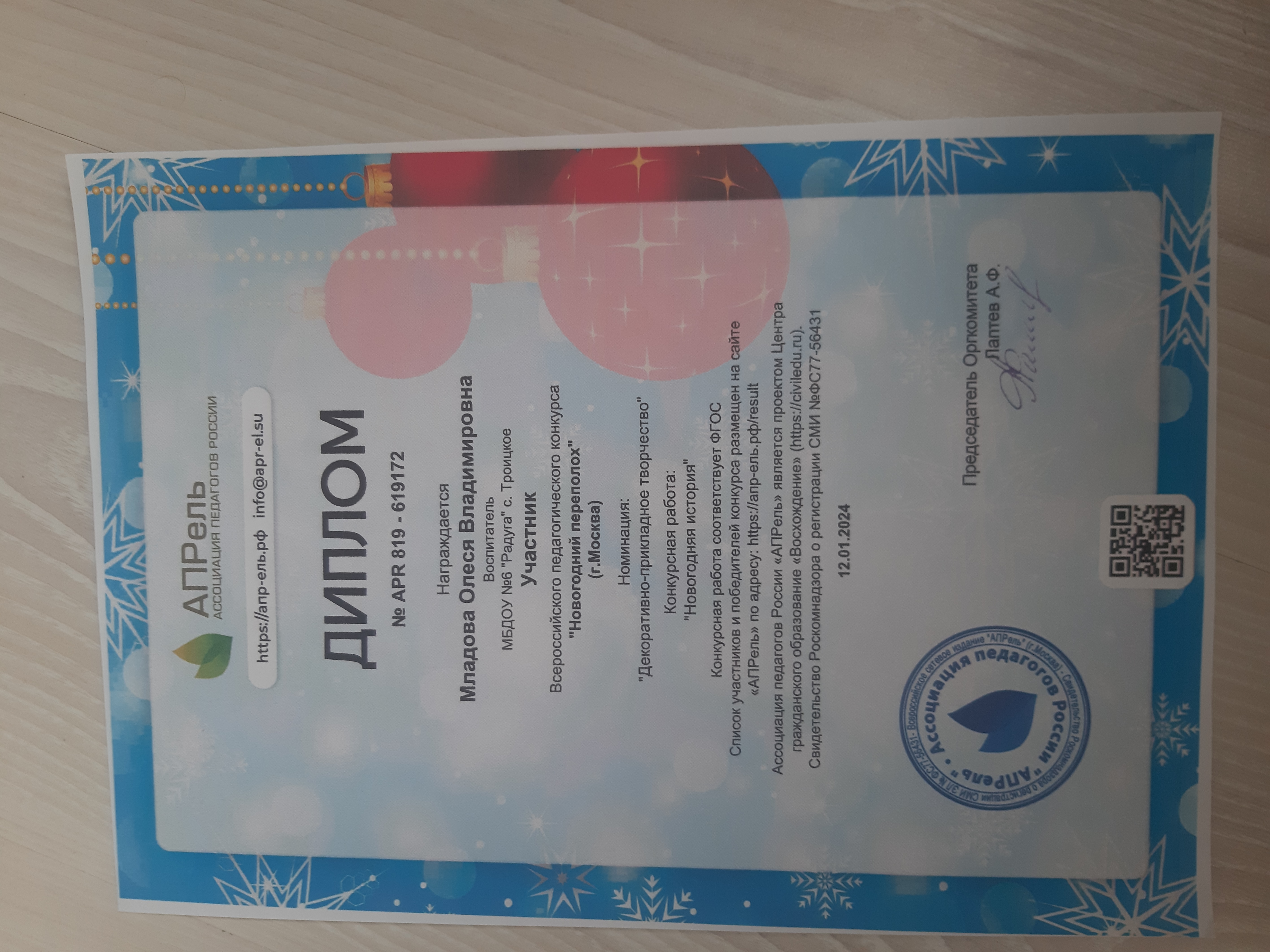 Диплом участника Всероссийского педагогического конкурса "Новогодний переполох" в номинации "Декоративно-прикладное творчество"