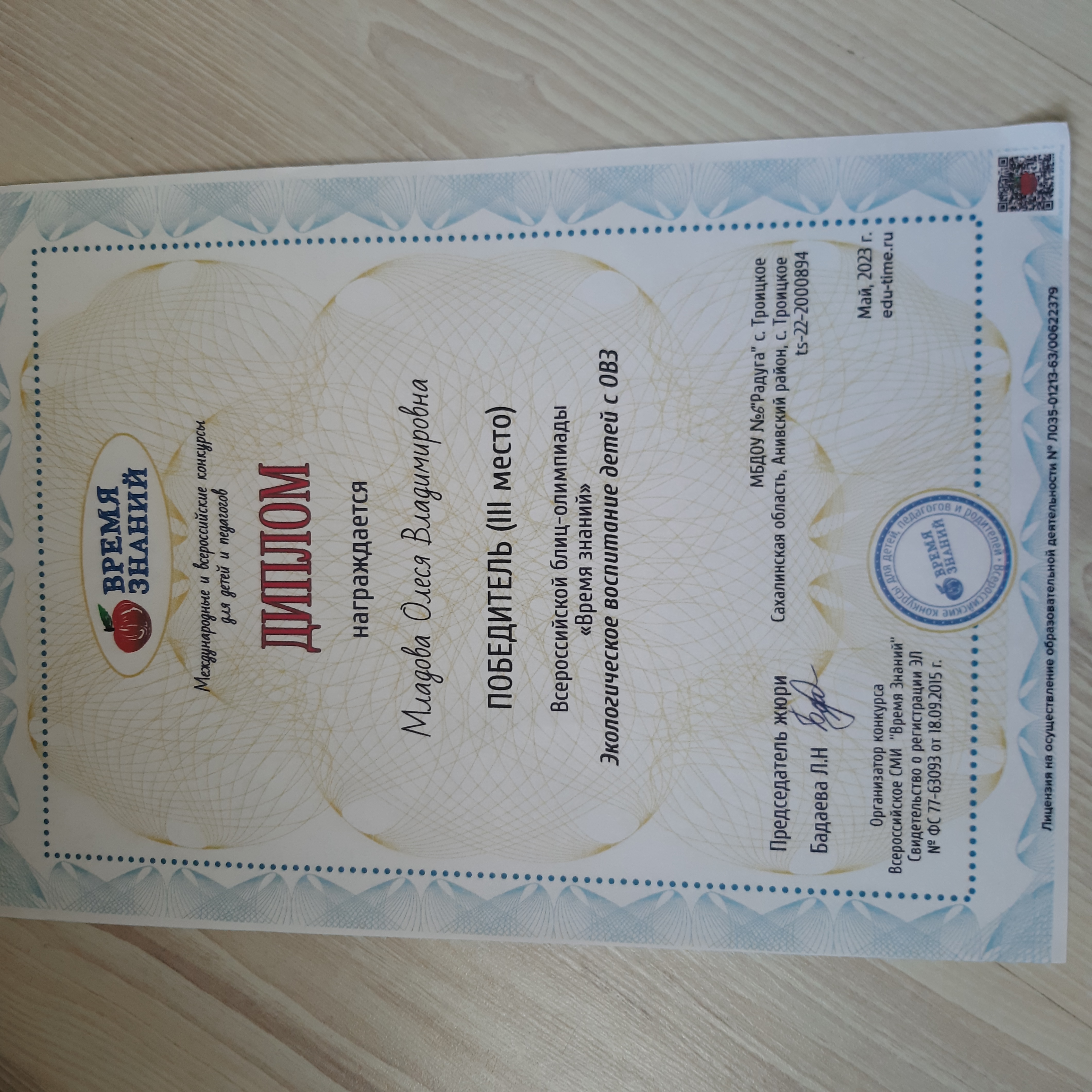 Диплом победителя (III место) во Всероссийской блиц-олимпиаде "Время знаний" Экологическое воспитание детей с ОВЗ
