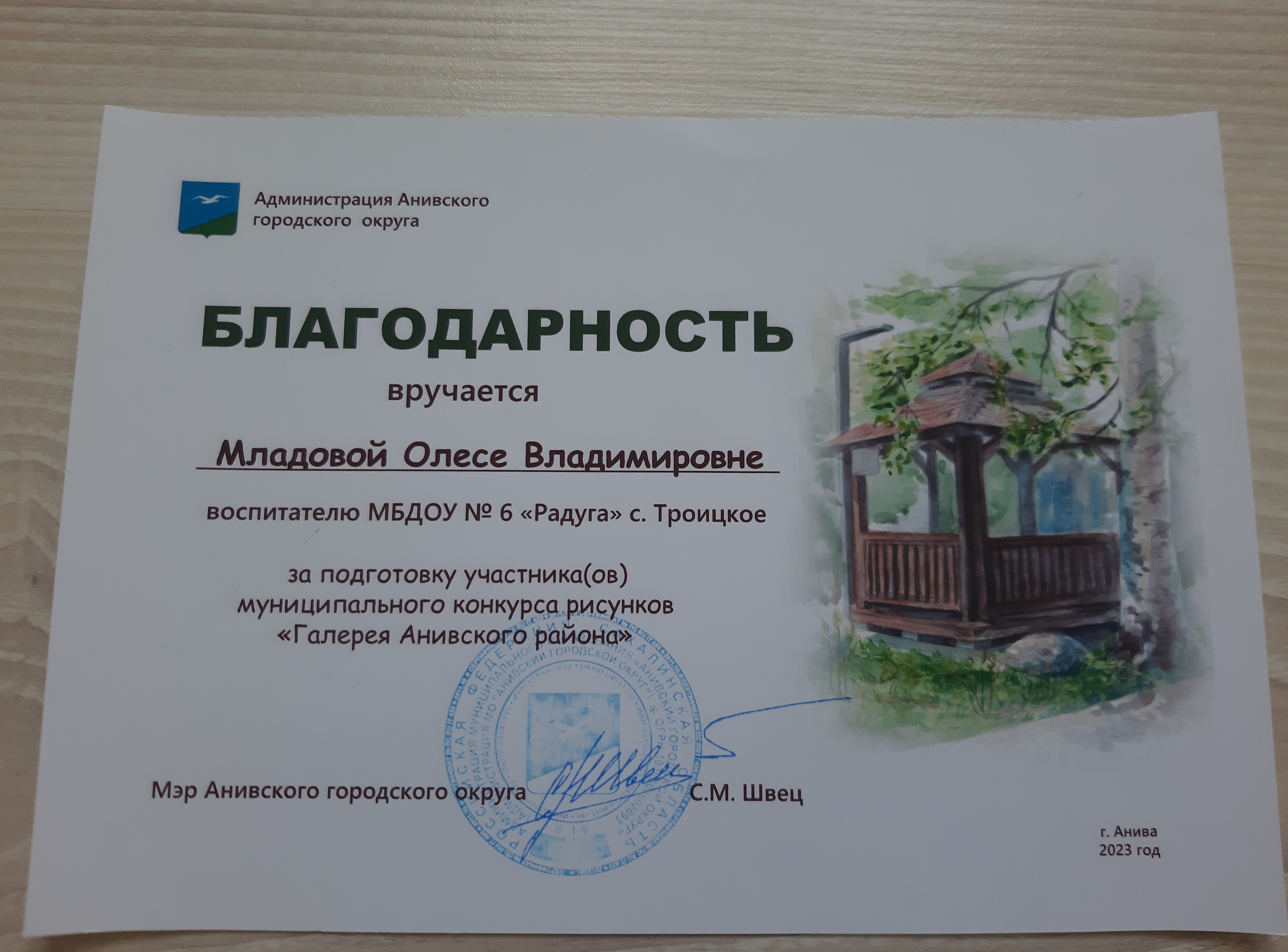 Благодарность за подготовку участников муниципального конкурса рисунков "Галерея Анивского района"