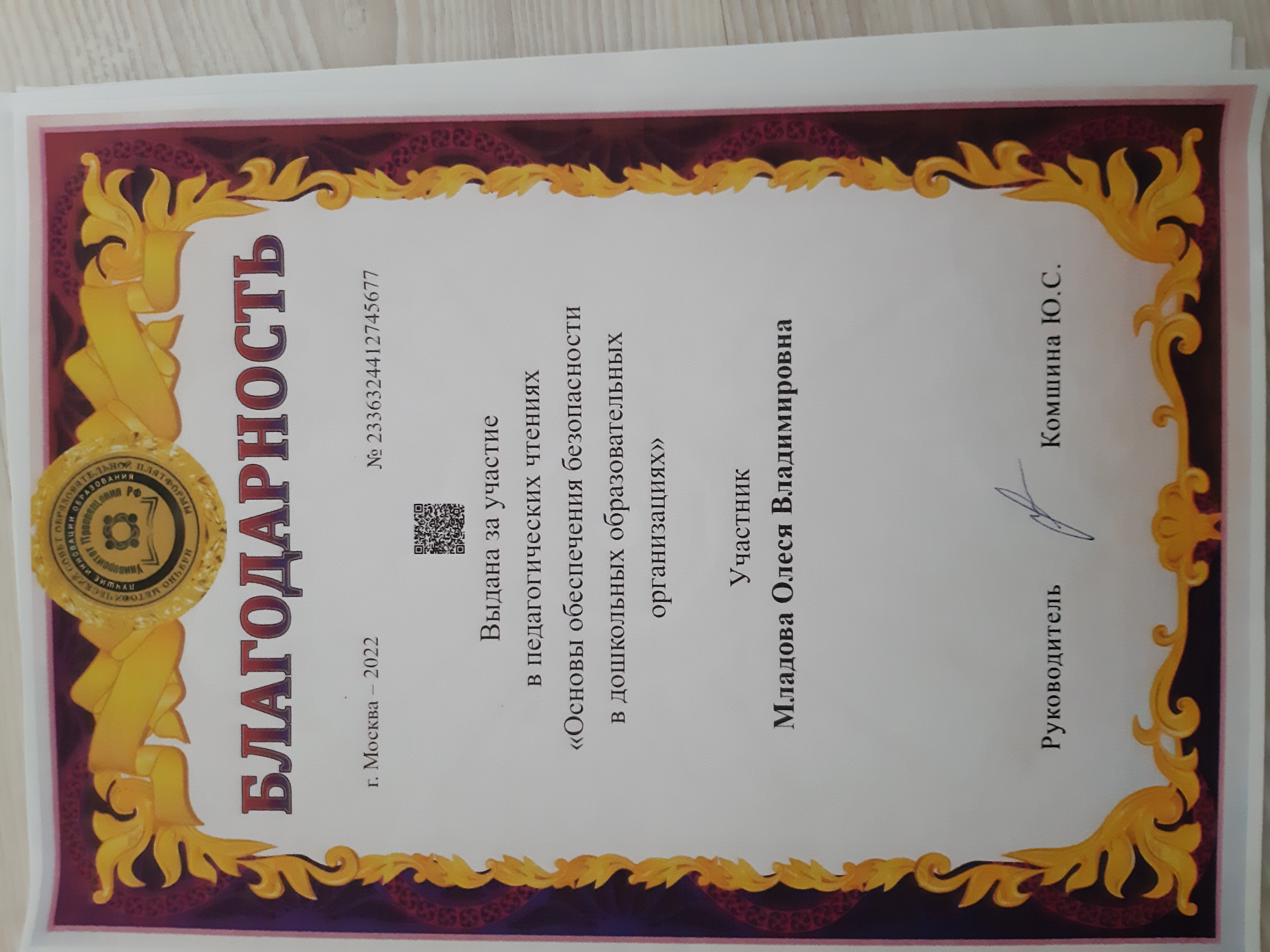 Благодарность за участие в педагогических чтениях "Основы обеспечения безопасности в дошкольных образовательных организациях"